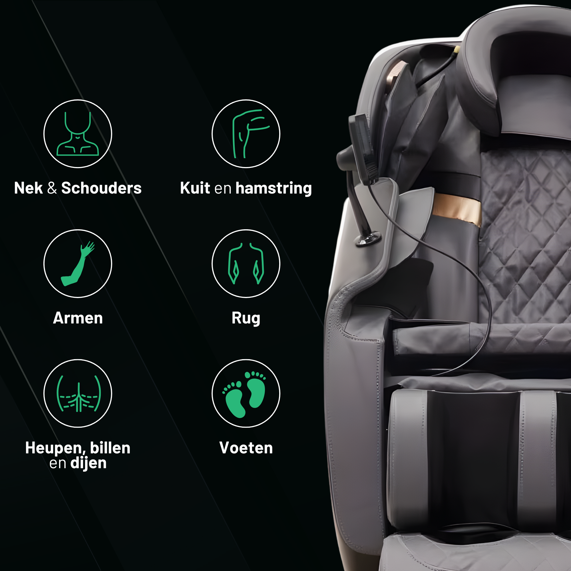 De combinatie van Shiatsu, kneden, roteren, omgekeerde rotatie en luchtcompressie creëert een volledige lichaamsbehandeling die spierspanning reduceert, stijve spieren versoepelt en herstelprocessen stimuleert.
