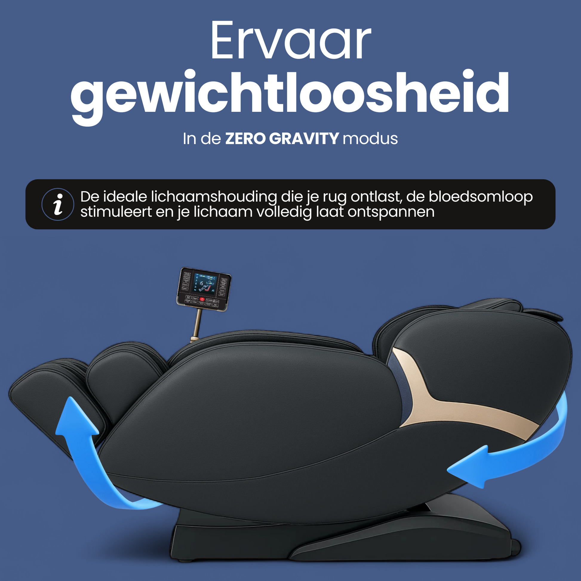 De Zero Gravity-functie kantelt de massagestoel zo dat je benen iets hoger liggen dan je hart, waardoor je wervelkolom volledig wordt ontlast en je gewicht gelijkmatig wordt verdeeld. Dit zorgt voor optimale ontspanning, betere bloedsomloop en een diepere, intensere massagebeleving.