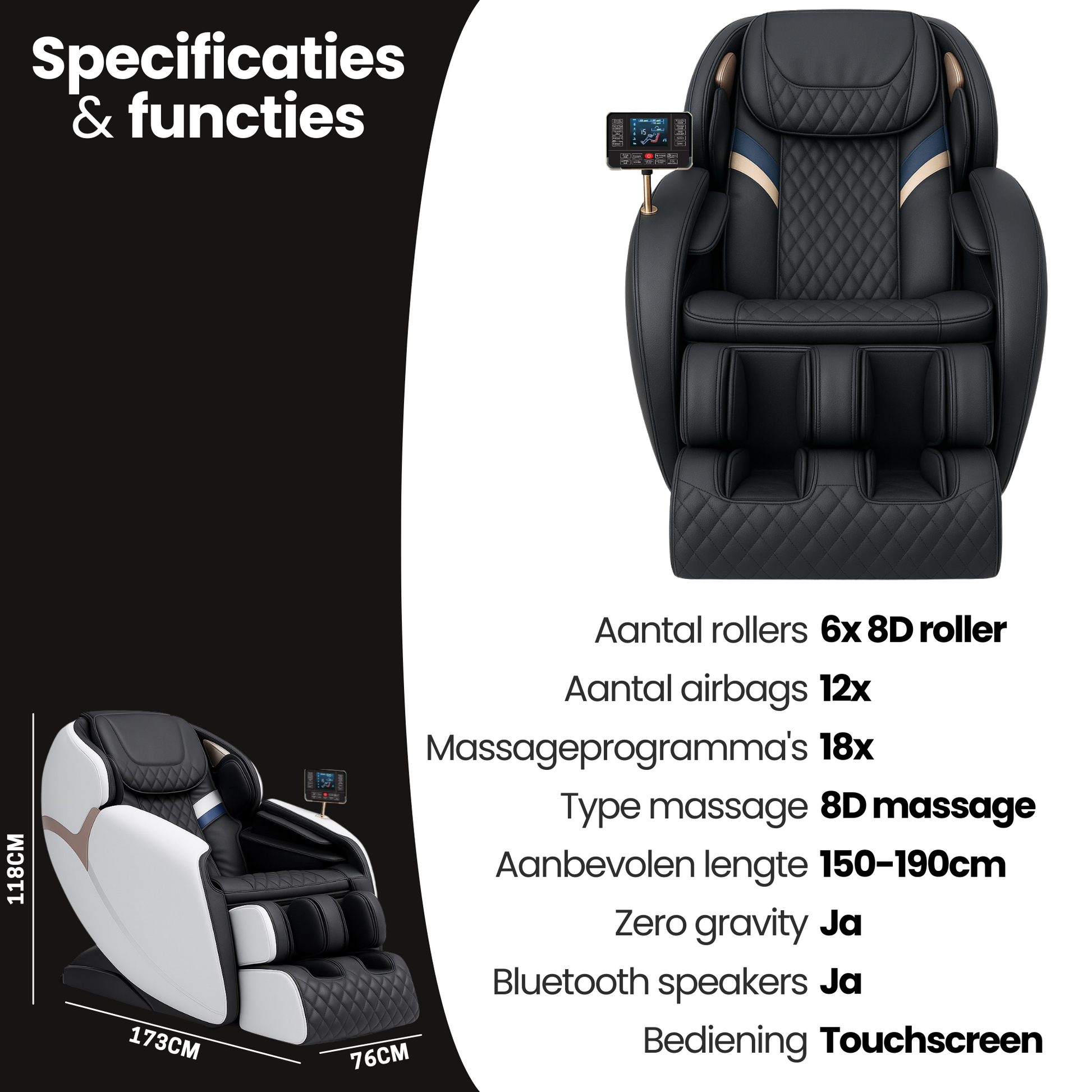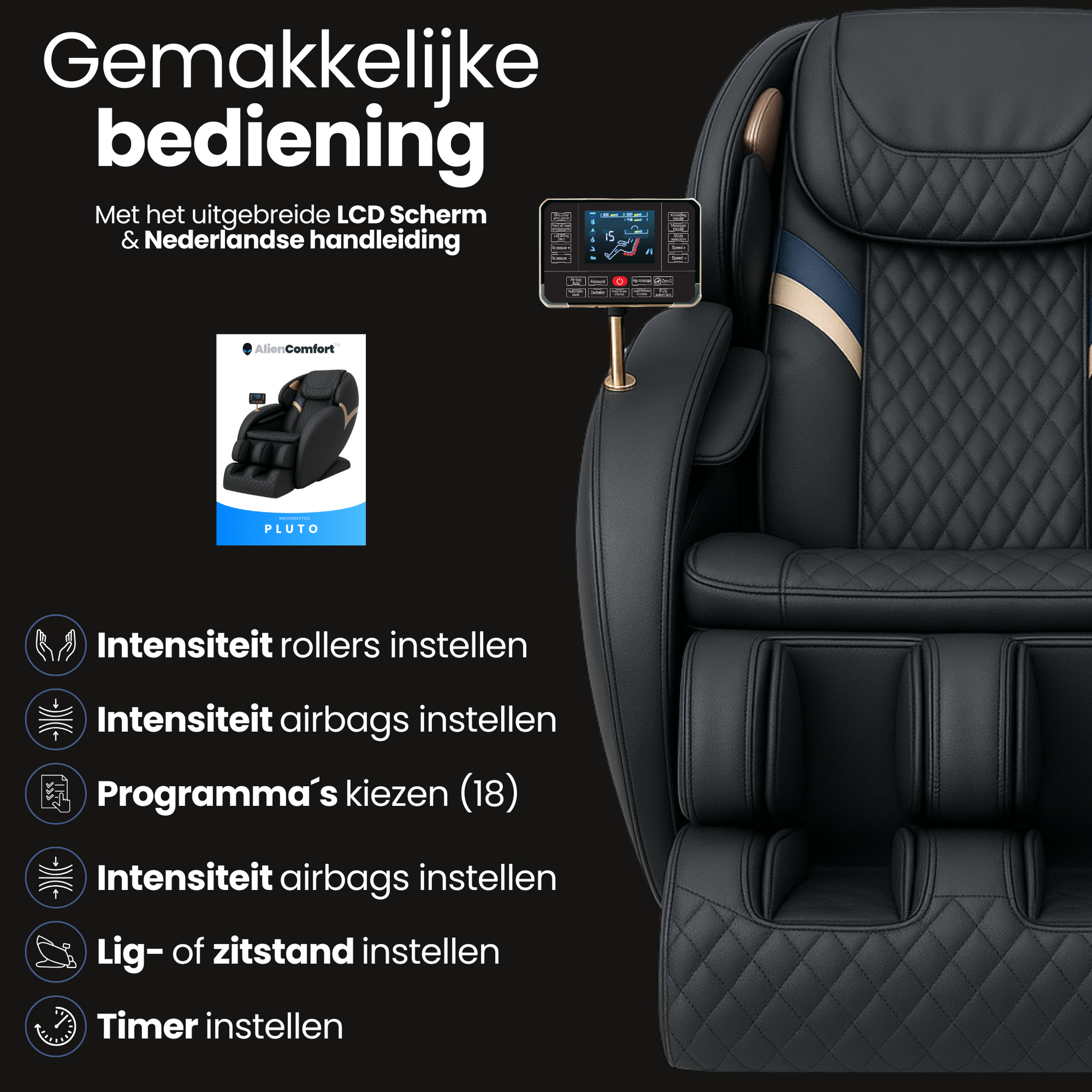 Stap in een wereld van pure ontspanning met de AlienComfort™ Massage Stoel PLUTO. Deze premium massagestoel is ontworpen om jouw dagelijkse leven te verrijken met diepe, doeltreffende full-body massages. Uitgerust met geavanceerde 8D-massagetechnologie, 18 automatische programma’s, Zero Gravity-positionering en een geïntegreerde voetenspa, levert de PLUTO een complete wellnesservaring die je spieren ontspant, je bloedsomloop stimuleert en stress laat verdwijnen – allemaal vanuit het comfort van je eigen huis.